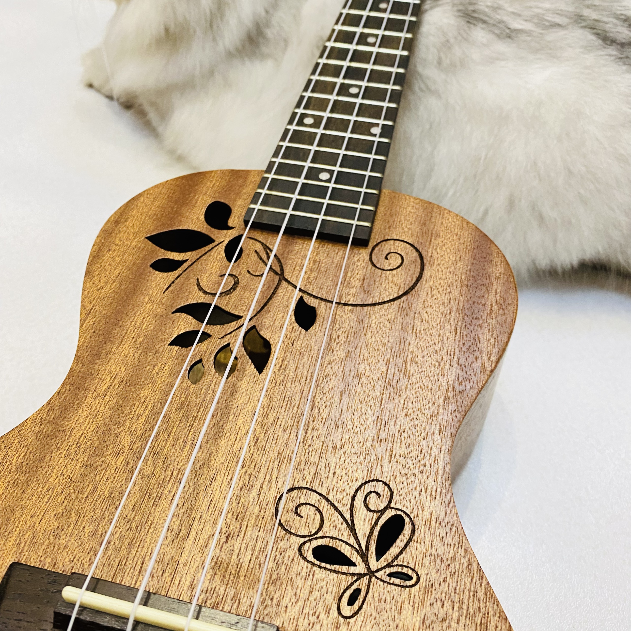 - Đàn ukulele UKU23 được sản xuất từ gỗ mahogany cho vân gỗ màu nâu sẫm tự nhiên đẹp mắt, khắc hình lá cây trên thùng và là lỗ thoát âm rất đặc biệt cực đáng yêu.