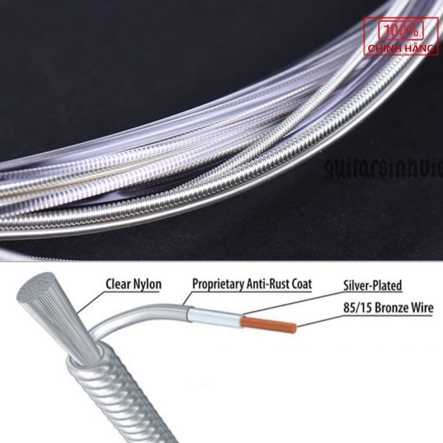 Dây đàn AC139 có đặc trưng là 3 dây streble bằng nylon titan chất lượng cao có màu tím nhạt rõ ràng rất đẹp mắt. Các dây bass D-4th, A-5th, E-6th được làm bằng sợi nylon đa lõi quấn bên ngoài là dây đồng mạ bạc có độ linh hoạt cao.Áp dụng công nghệ chống gỉ của lớp phủ, thời gian chống gỉ của dây dài hơn 4-5 lần so với loại dây thông thường khác.